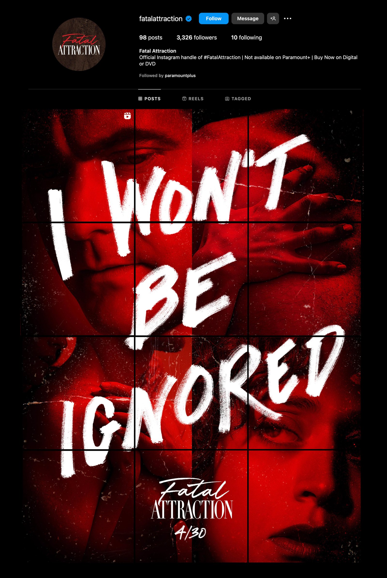 For Fatal Attraction, a series reimagining the iconic 1987 film, I developed key art inspired by the infamous scene that coined a cultural term: "Bunny Boiler.” Instead of depicting the literal imagery, I crafted a subtler visual by pairing boiling water with shadows and impressions of a rabbit, maintaining an unsettling essence while avoiding overtly graphic elements. Despite positive initial feedback, the directive from leadership was clear: “No bunnies!” Later, I would design and pitch a concept for an Instagram grid takeover, inspired by the obsessive energy of The Shining's “All work and no play…” imagery. The signature phrase, “I will not be ignored,” would repeat endlessly across a seamless 24-panel grid. After multiple revisions and approvals, the final execution distilled the concept into a bold, singular rendering of the phrase—large, impactful, and unavoidable—spanning a 12-panel grid with arresting visual intensity. This project reflects my ability to evolve creative ideas through feedback while retaining their core emotional impact.
