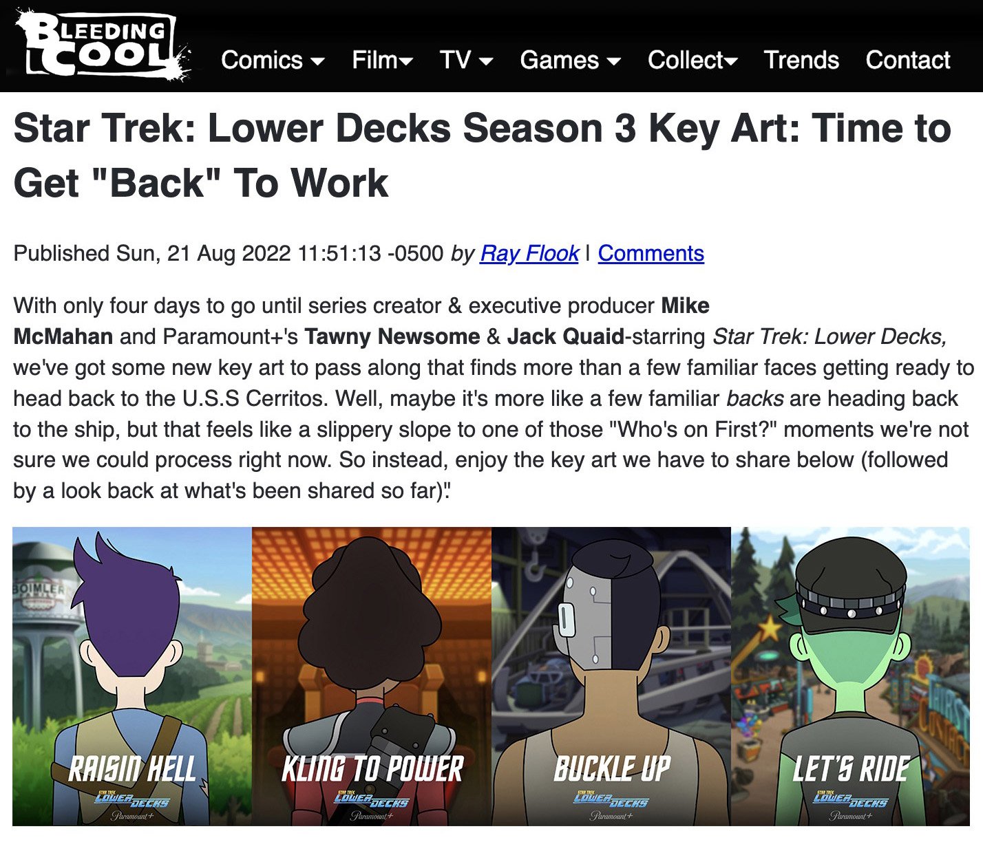 Among the many pieces I created to promote Star Trek: Lower Decks, this campaign stands out as one of my favorites. Tasked with ideating hero art concepts for the new season, I proposed an unconventional idea: showcasing the characters with their backs to the camera. While initially meeting with resistance from some who insisted on a need to show the characters’ faces, this approach leaned into an "If you know, you know" appeal, leveraging the established fanbase’s familiarity with the characters’ silhouettes, costumes, and settings. When paired with some clever wordplay I wrote for tag lines, this unique strategy worked perfectly for an established audience familiar with the series. The resulting "Back to Lower Decks" campaign was a viral success, sparking discussions in Star Trek fan circles and earning media coverage in Bleeding Cool. It teased the new season by withholding direct character reveals, transforming mystery into anticipation and celebrating the fandom’s insider knowledge.